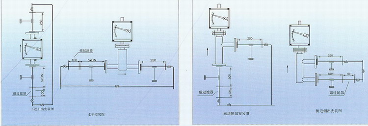 流量計應垂直安裝,流量計中心線與鉛垂線的夾角不超過5°。在累計的上游須保證五倍公稱通徑的入口直管段,下游保證