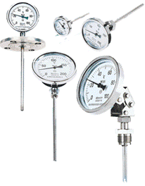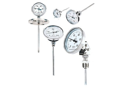 雙金屬溫度計是基于繞制成環性彎曲狀的雙金屬片組成。一端受熱膨脹時,帶動指針旋轉,工作儀表便顯示出熱電勢所應的溫度值。