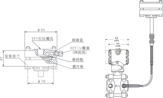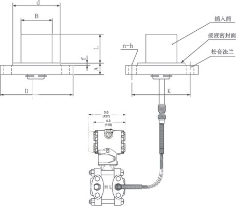 AK-3051GP單法蘭液位變送器是一種通過安裝在管道或容器上的遠傳裝置來感受被測壓力,該壓力經毛細管內的灌充硅油(或其它的液體)傳遞至變送器的主體,然后由變送器主體內的δ室和放大線路板,將壓力或差壓轉換4~20mA.DC信號輸出(參見結構原理圖)。 |