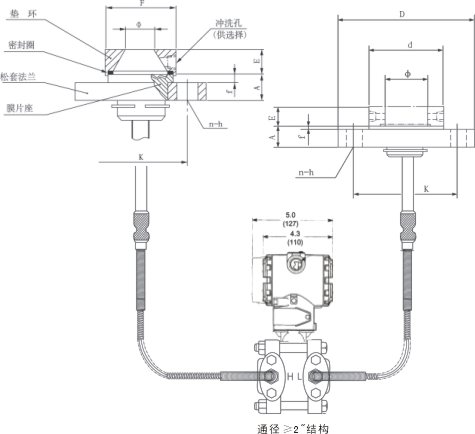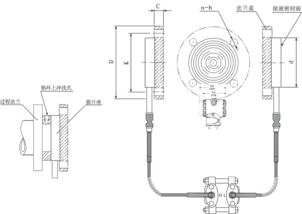 AK-3051DP雙法蘭液位變送器是一種通過安裝在管道或容器上的遠傳裝置來感受被測壓力,該壓力經毛細管內的灌充硅油(或其它的液體)傳遞至變送器的主體,然后由變送器主體內的δ室和放大線路板,將壓力或差壓轉換4~20mA.DC信號輸出(參見結構原理圖)。 |