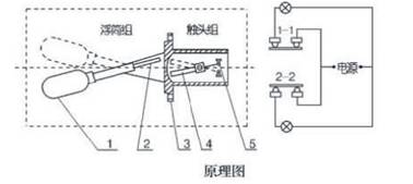 控制器由浮筒組與觸頭組二大部分組成。當(dāng)被測液位升高或降低時(shí),浮筒(1)隨之升降,使用其端部的磁鋼(2)上下擺動(dòng),通過磁力排斥安裝在外殼(3)內(nèi)相同磁極的磁鋼(4)上下擺動(dòng)。其另一端的觸頭(5)便在靜觸壯舉1—1,及2—2間連通或斷開,隨即在電路中的信號(hào)裝置發(fā)出光或聲的信號(hào),或啟閉電動(dòng)泵供液或收液。 |
