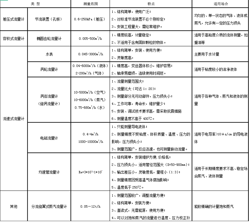 從上述表中,我們可以看出,適用于蒸汽流量測量的只有4種,即節(jié)流裝置(孔板)、渦街流量計(jì)(旋渦流量計(jì))、均速管流量計(jì)、分流旋翼式蒸汽流量計(jì)。?